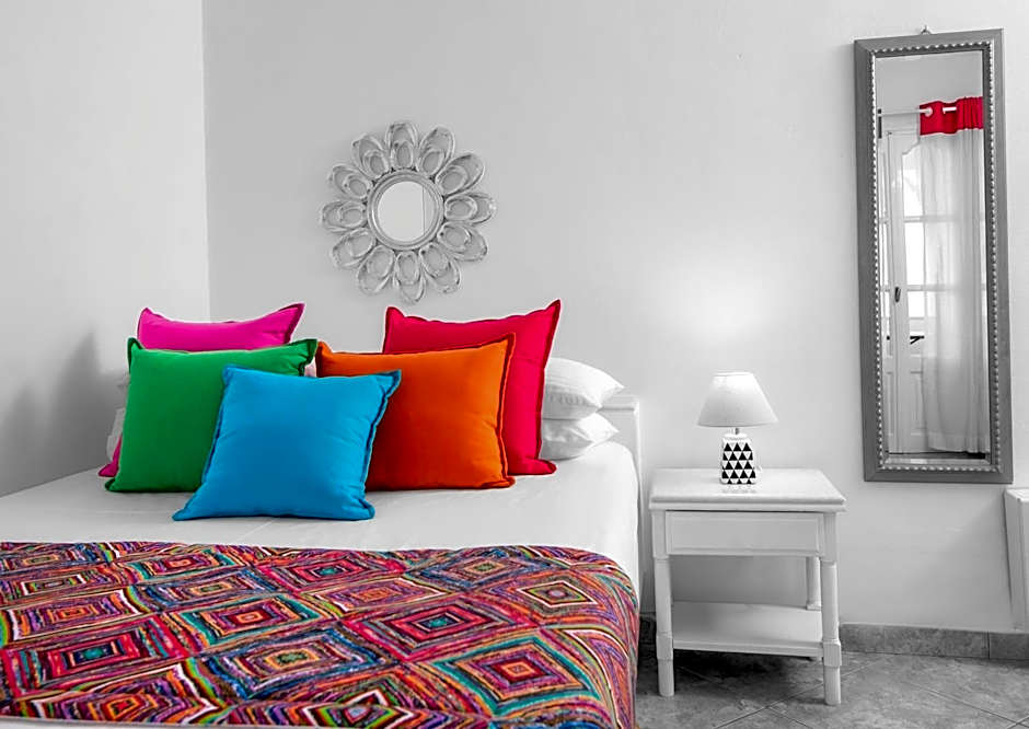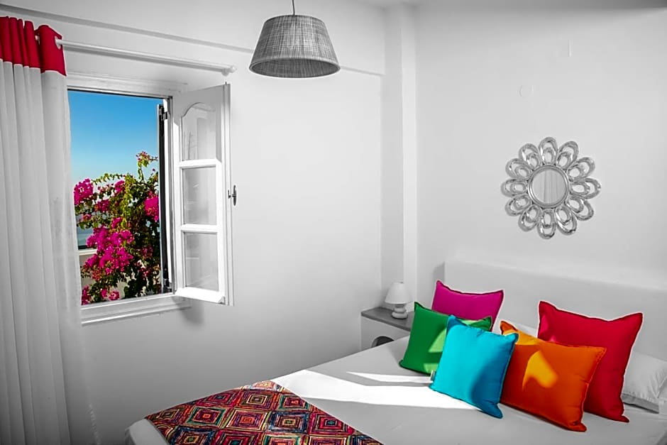 Studio with view of Thirassia Island and the Caldera. It includes a double bed, bathroom, air conditioning, refrigerator, satellite TV, hairdryer (on request) and balcony or terrace.